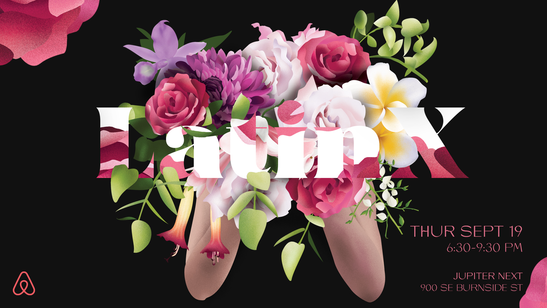 In support of the local Spanish speaking community in Portland, Airbnb decided to host an opening event to celebrate LatinX Heritage Month which needed an event logo along with flower illustrations for their Como La Flor theme.